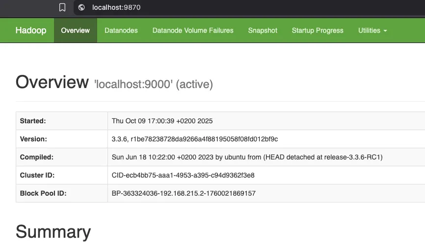 Pendiente, acceso al nodo a través del puerto 9864 http://localhost:9864/ → Menos opciones ya que accedemos a un nodo determinado