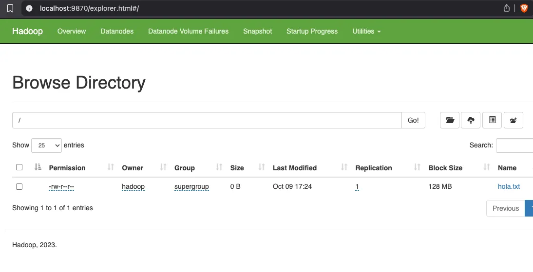 Connecting to namenode via http://debianh:9870/fsck?ugi=hadoop&files=1&blocks=1&path=%2Fhola.txt FSCK started by hadoop (auth:SIMPLE) from /127.0.0.1 for path /hola.txt at Mon Nov 06 14:08:52 CET 2023