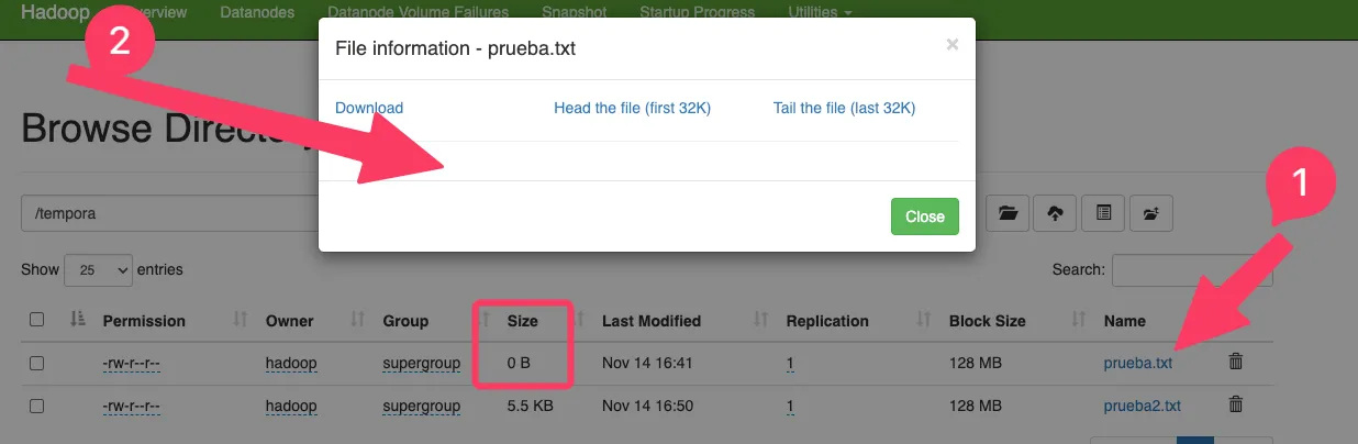 saludo.txten local, que contenga el texto “Hola”. Súbelo a HDFS, a la carpeta /temporal (si no existe hay que crearla) Borra el fichero en local Muestra el contenido del fichero (en remoto). - Copia el fichero saludo.txt a local con el nombre (saludolocal.txt)