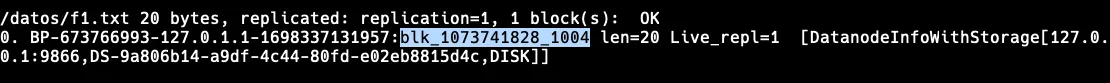 /temporal/prueba.txt 5 bytes, replicated: replication=1, 1 block(s): OK 0. **BP-673766993-127.0.1.1-1698337131957**:blk_**1073741825**_1001 len=5 Live_repl=1Ahora vamos a comprobar cómo HDFS ha guardado el archivo en local. Para ello vamos a:
